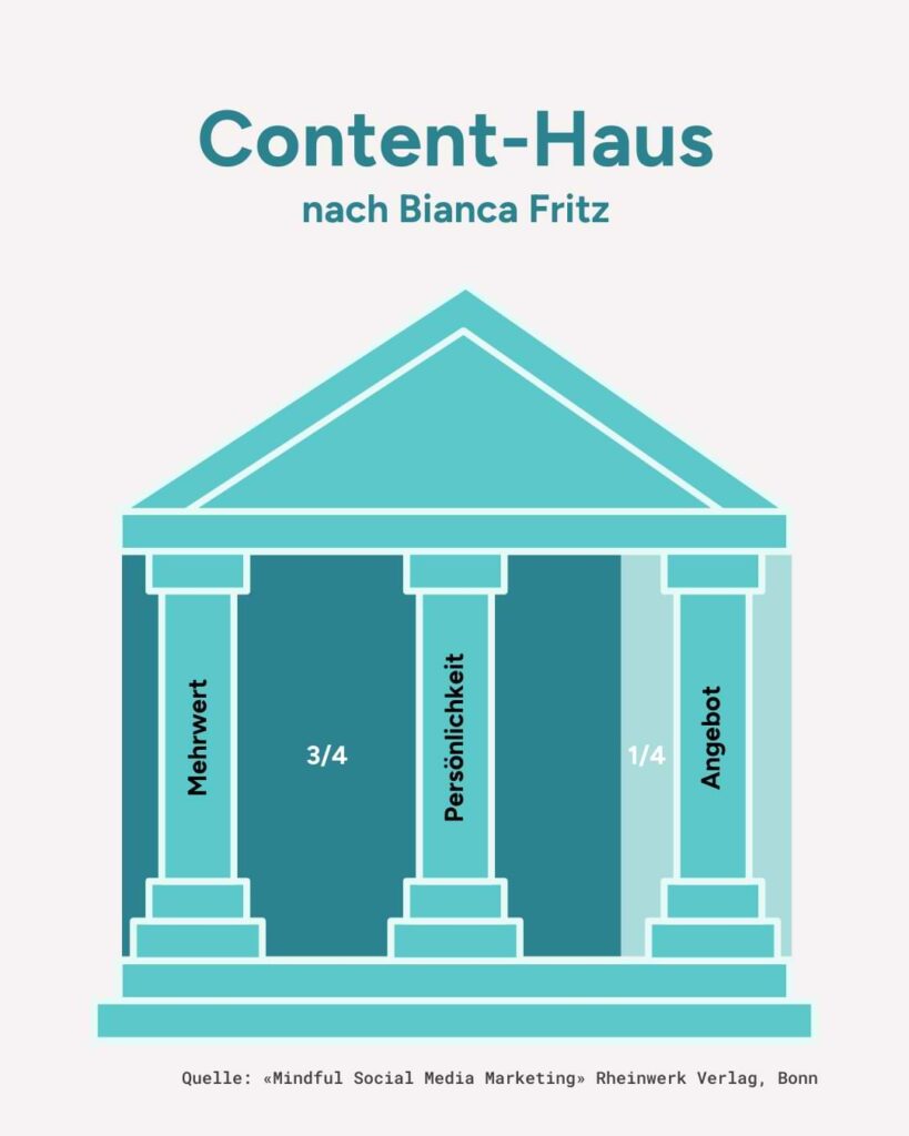 Bianca Fritz gibt in ihrem Buch «Mindful Social Media Marketing» die folgende Daumenregel aus: «Auf drei Portionen wertvolle Inhalte darf eine Portion Werbung für Deine Angebote kommen.»
