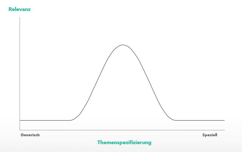 Damit Content relevant für die Zielgruppe ist, darf das Thema weder zu generisch, noch zu speziell sein. Stattdessen müssen Inhalte in der Mitte des Spektrums angesiedelt sein, um möglichst vielen Rezipienten einen besonderen Mehrwert zu bieten.