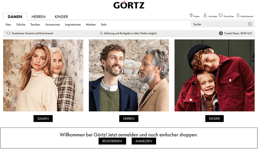 Bei Goertz.de kannst Du auf der Startseite z. B. wählen, ob Du Produkte für Frauen, Männer oder Kinder benötigst.