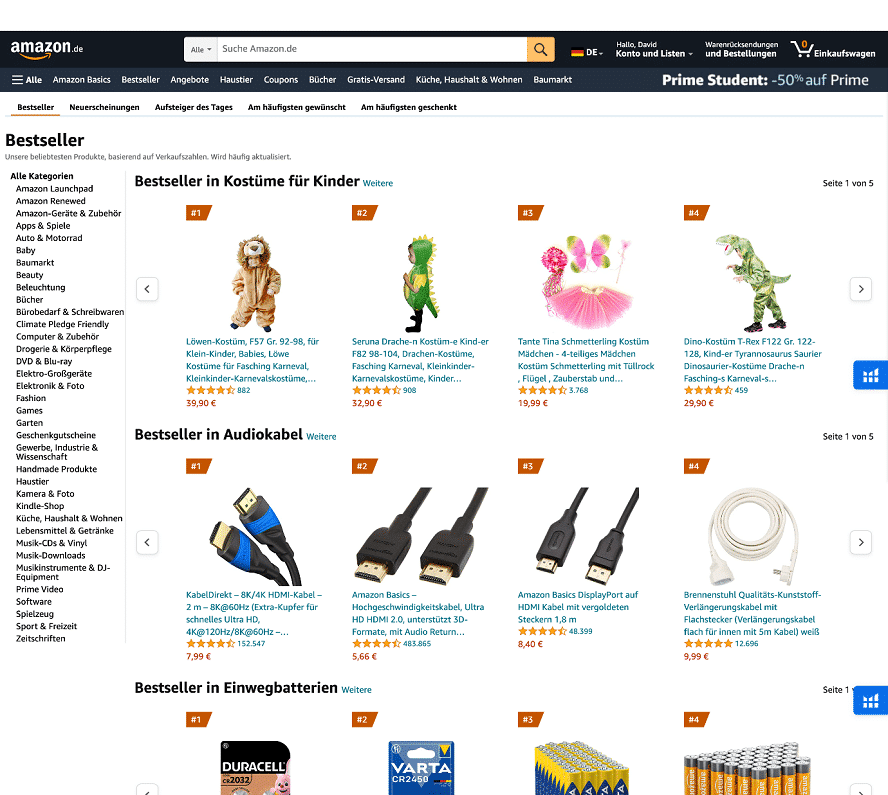 - Schaue Dir die meistverkauften Produkte jeder Kategorie auf Amazon an und suche nach ähnlichen Artikeln in der jeweiligen Kategorie. Hilfreich ist hier auch die Anzeige „Kunden kauften auch“.