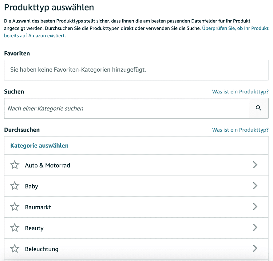 Bist Du die oder der erste Verkäufer:in der Handelsware, stellst Du es neu auf Amazon ein. Hierfür klickst Du unter „Lagerbestand“ und „Produkt hinzufügen“ auf „Eigenes Produkt erstellen“. Nachdem Du eine neue Produktdetailseite angelegt hast, wählst Du aus den vorgegebenen Produktkategorien aus.