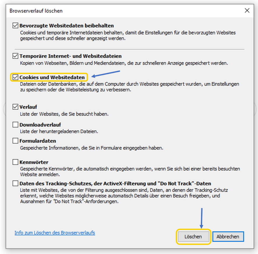 Textdateien im Internet Explorer zu löschen, ist grundsätzlich ähnlich wie beim Edge-Browser. Beim Internet Explorer findet sich unter dem Punkt Einstellungen der Menüpunkt „Sicherheit.“ Von dort aus kann der Menüpunkt „Browserverlauf löschen“ zum gewünschten Ergebnis führen. Unter „Cookies und Websitedaten“ einfach auf Löschen klicken.