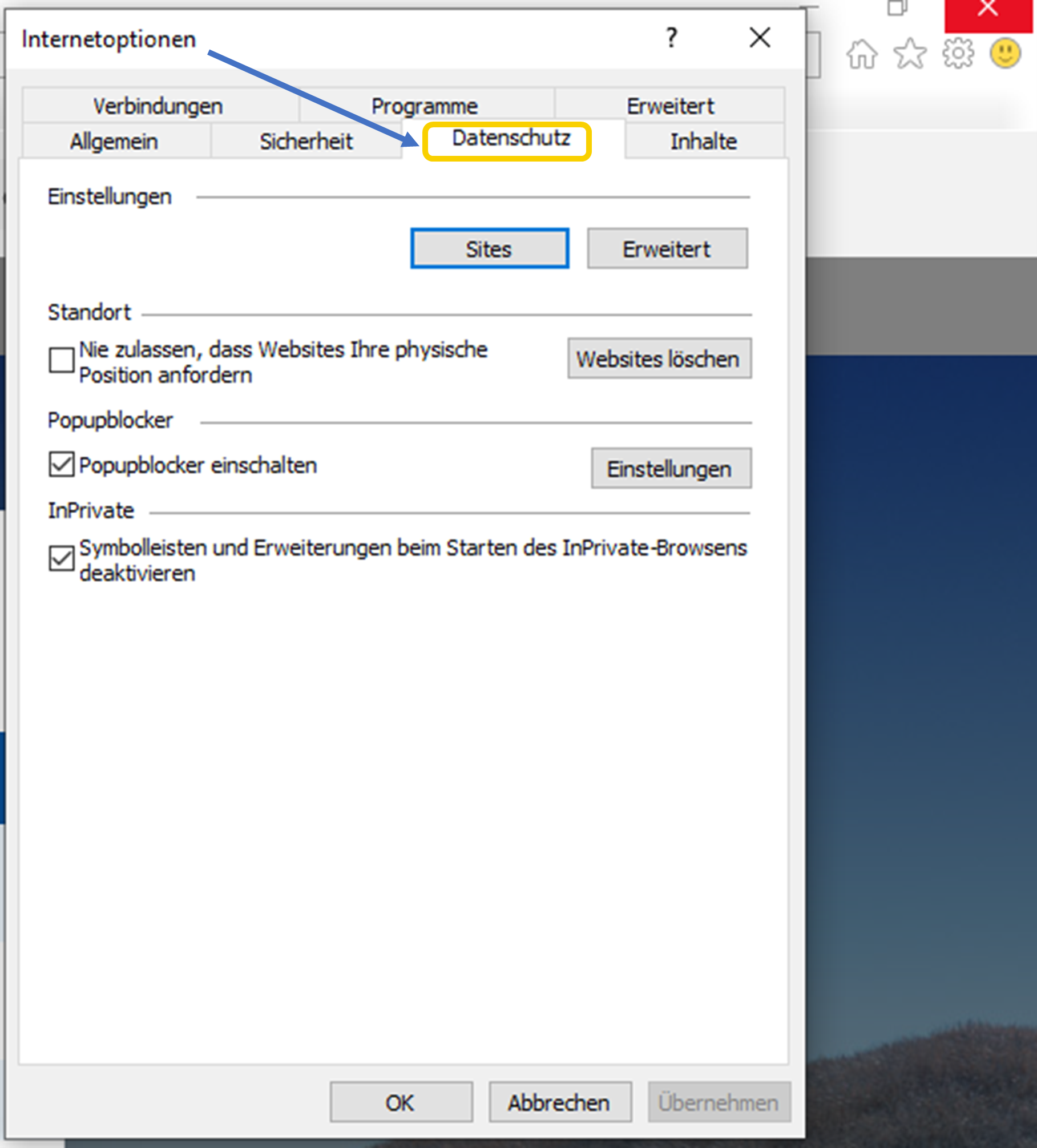 Sollen weiterführende Cookie-Einstellungen gemacht werden, ist im Internet Explorer ein Zahnradsymbol vorhanden. Nach dem Klick darauf erscheint der Punkt „Internetoptionen“ (wie im oberen Bild angezeigt) und darunter die Schaltfläche „Datenschutz“ in der Menüleiste.