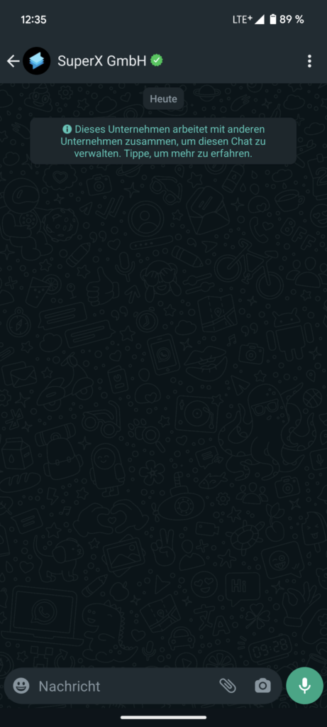 Nutzt ein Unternehmen die Whatsapp Cloud API, wird die folgende Nachricht angezeigt: “Dieses Unternehmen verwendet einen sicheren Service von Meta, um diesen Chat zu verwalten.“