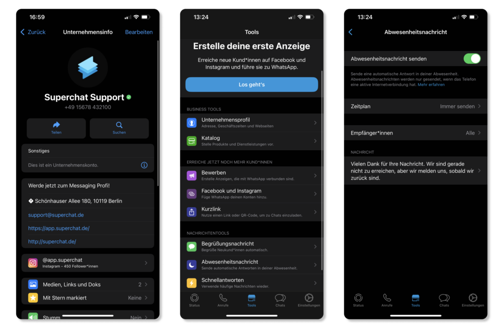 Ein Beispiel für ein fertig eingerichtetes Whatsapp Unternehmensprofil. Quelle: Superchat
