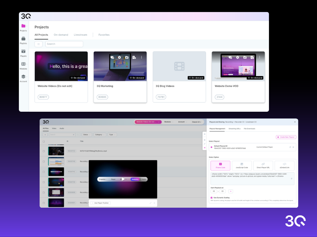 Die 3Q Video-Plattform ermöglicht Unternehmen und Agenturen jeder Größenordnung, Ihre AV-Inhalte zu hosten, zu verwalten und zu verbreiten – Live und On-Demand, über Websites und Apps. Die White-Label-Lösung von 3Q für Videoportale bietet zudem Zugang zu vollständig kontrollierten und verwalteten AV-Inhalten mit einer zentralen Medienbibliothek, die Einblicke und Analysen über die Streaming-Performance der einzelnen Inhalte liefert.
