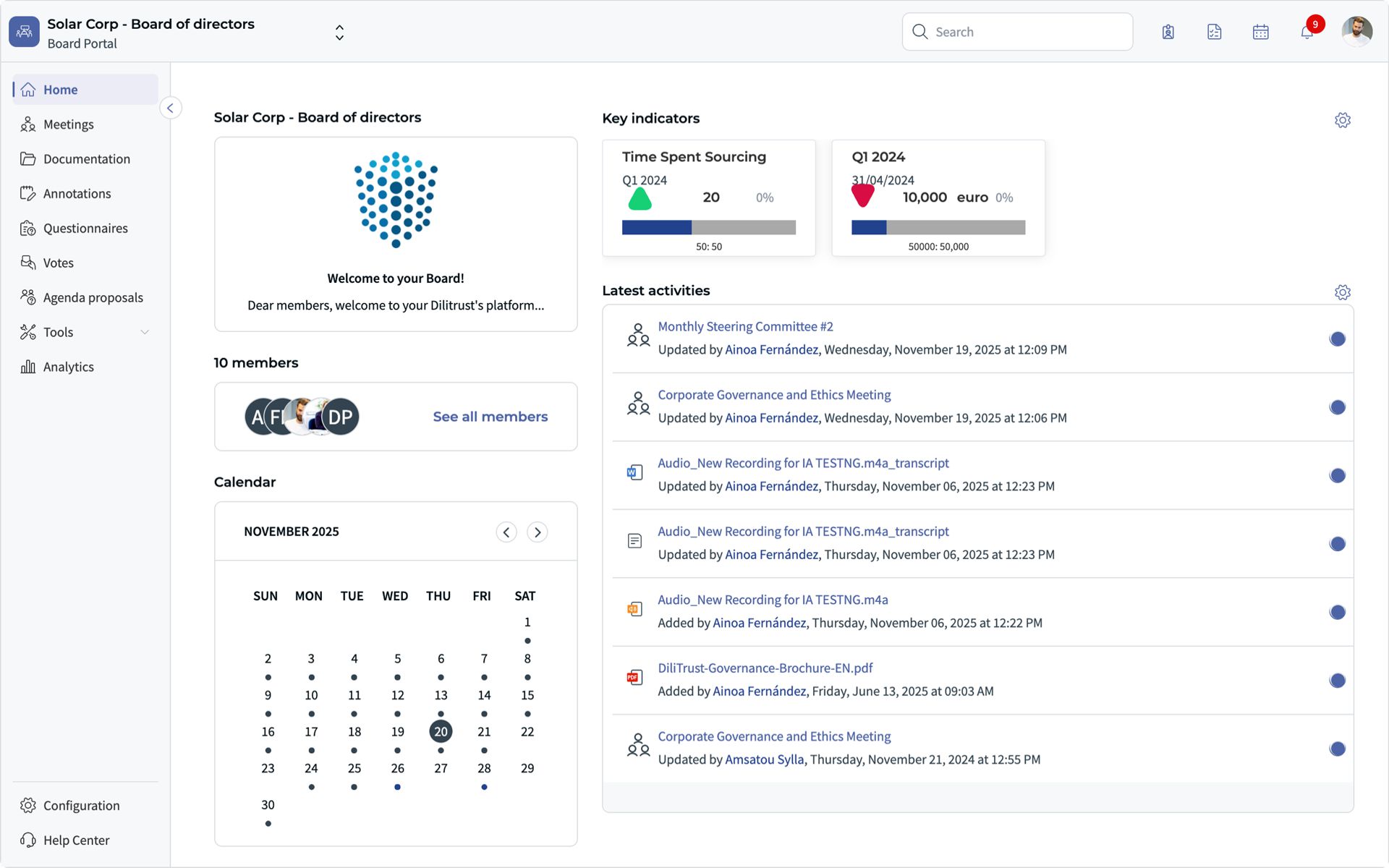 - Im Board Portal arbeiten Boardmitglieder und Board Manager effizient und vertraulich zusammen, unterstützt durch moderne Governance-Funktionen auf Enterprise-Niveau.