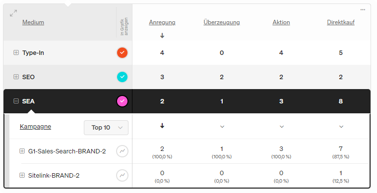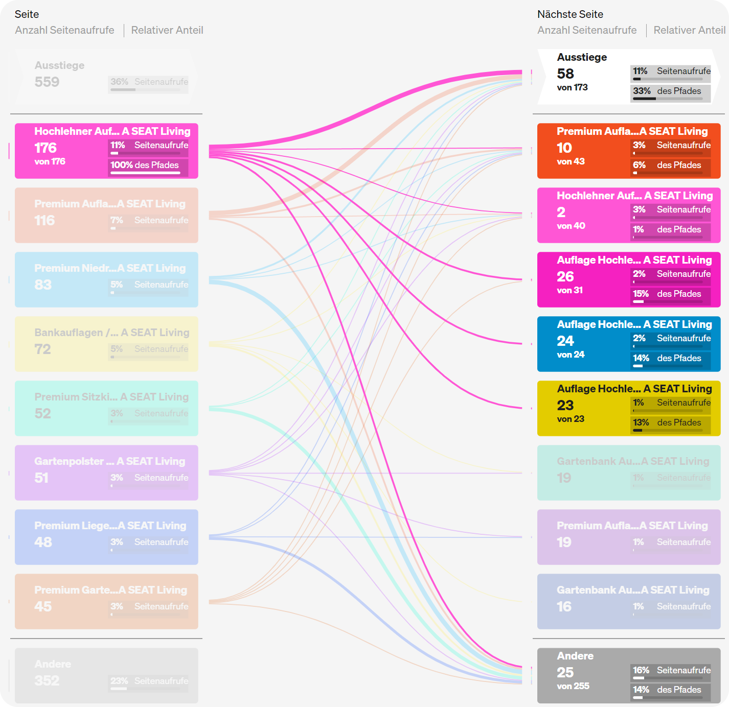 Diese Analyse hilft Dir, zu verstehen, ob Deine Marketing-Maßnahmen erfolgreich sind. Erfahre, wann Nutzer:innen aussteigen und was sie zum Abschluss einer Conversion animiert. Dank Klickpfadanalysen bekommst Du einen umfassenden auf das Nutzerverhalten mit Deiner Seite.
