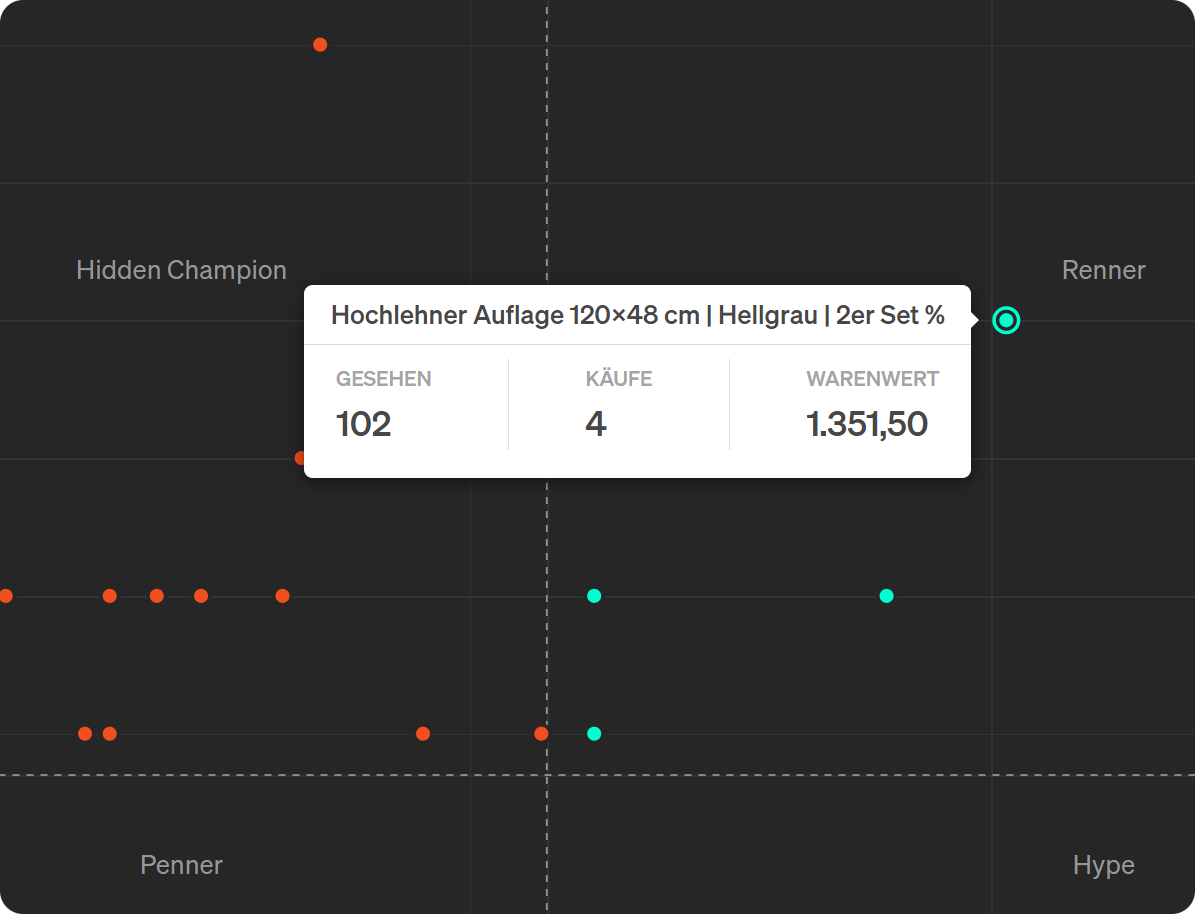 Betreiber:innen eines Webshops finden hier ihr Analyse-Glück. Deine Produktperformance kannst Du in diesem Bereich ausführlich betrachten.