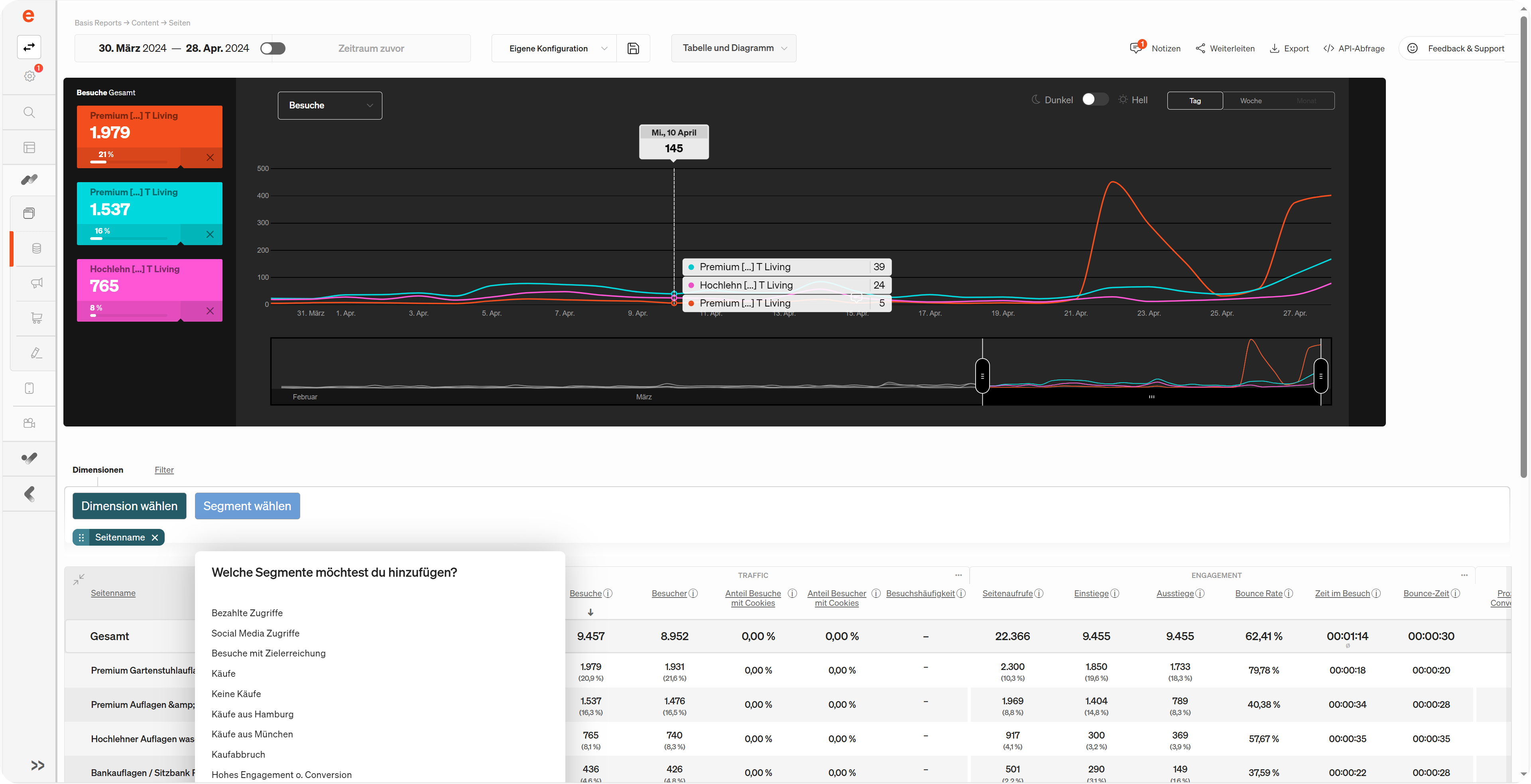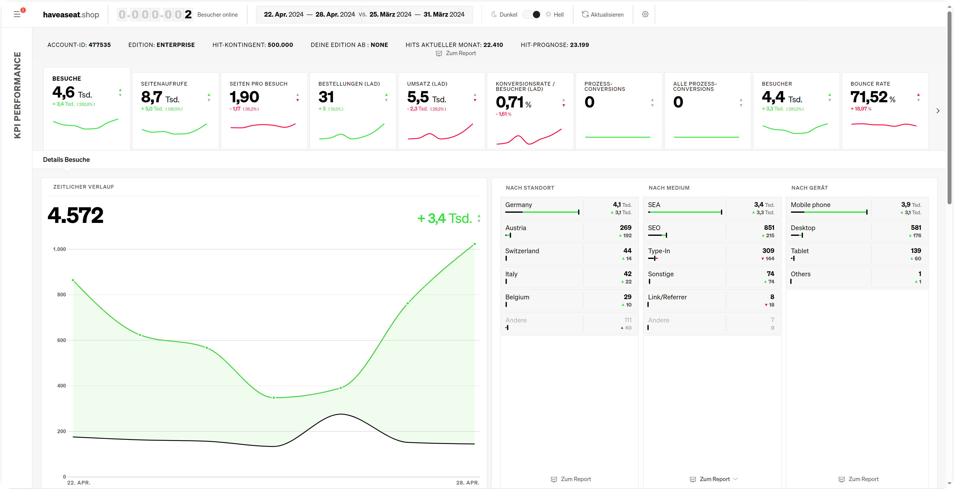 Das Tool ist für verständliche und übersichtliche Analysen konzipiert. Das Dashboard öffnet sich, gleich nachdem Du Dich mit Deinen Zugangsdaten eingeloggt hast. Auf dieser Seite sind alle wichtigen Kennzahlen aufgeführt, die Dir einen tiefen Einblick in Deine Daten liefern. Du kannst das Dashboard nach Belieben selbst konfigurieren.
