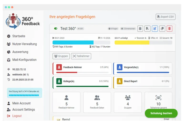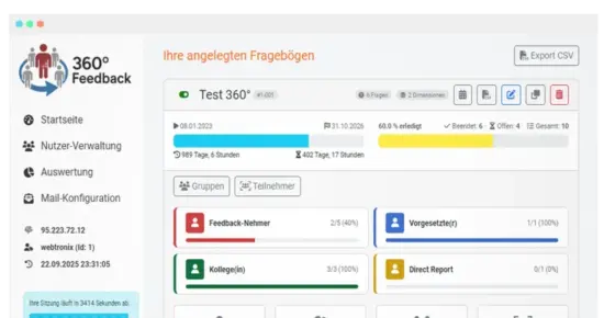 Die 360 Grad Feedback Software von FEEDWARE ist eine hochgradig automatisierte Plattform, die den gesamten multiperspektivischen Feedback-Zyklus im Unternehmen abbildet. Sie kombiniert wissenschaftlich fundierte Methoden und automatisierte Abläufe mit persönlicher Begleitung, um Führungskräften und Teams eine ganzheitliche Entwicklungsgrundlage zu liefern. Die Software sammelt das Selbstbild und Fremdbild aus verschiedenen Perspektiven (Vorgesetzte, Kollegen, Mitarbeiter), bündelt alle Daten in transparenten, sofort nutzbaren Ergebnisberichten und leitet daraus konkrete Coaching- und Entwicklungsmaßnahmen ab. Sie dient der gezielten Förderung von Kompetenzen, der Etablierung einer starken Feedback-Kultur und dem Effizienzgewinn in HR-Prozessen.