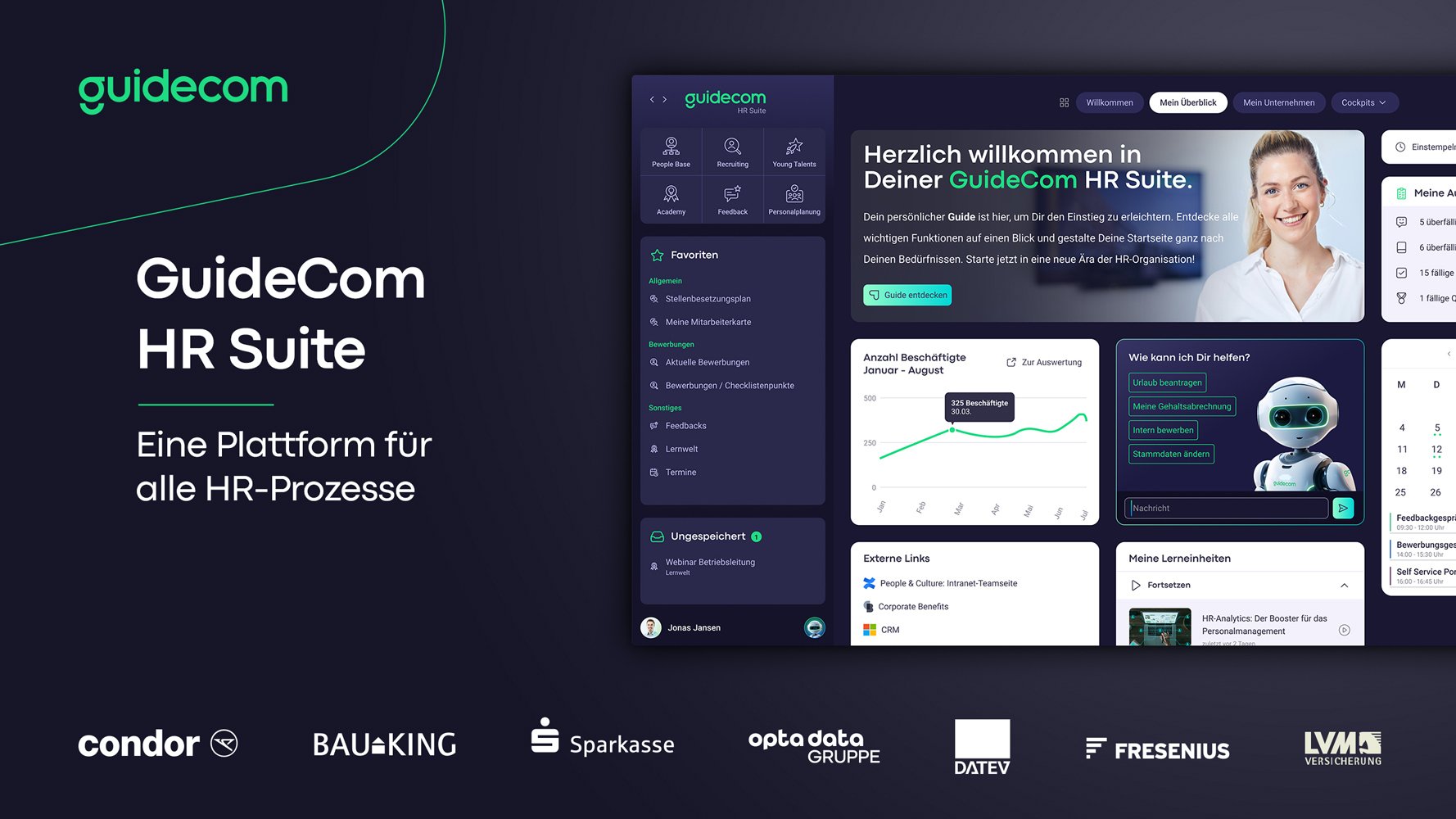 Die GuideCom HR Suite ist speziell für die Anforderungen von mittelständischen und Großunternehmen entwickelt, die ihr Personalmanagement digital und zukunftsfähig gestalten möchten. Mit der GuideCom HR Suite werden die Themen, Aufgaben und Wünsche aller Rollen einer Personalabteilung so abgebildet, dass alle Prozesse einzeln, aber auch im Zusammenspiel optimal unterstützt werden – HR komplett gedacht.