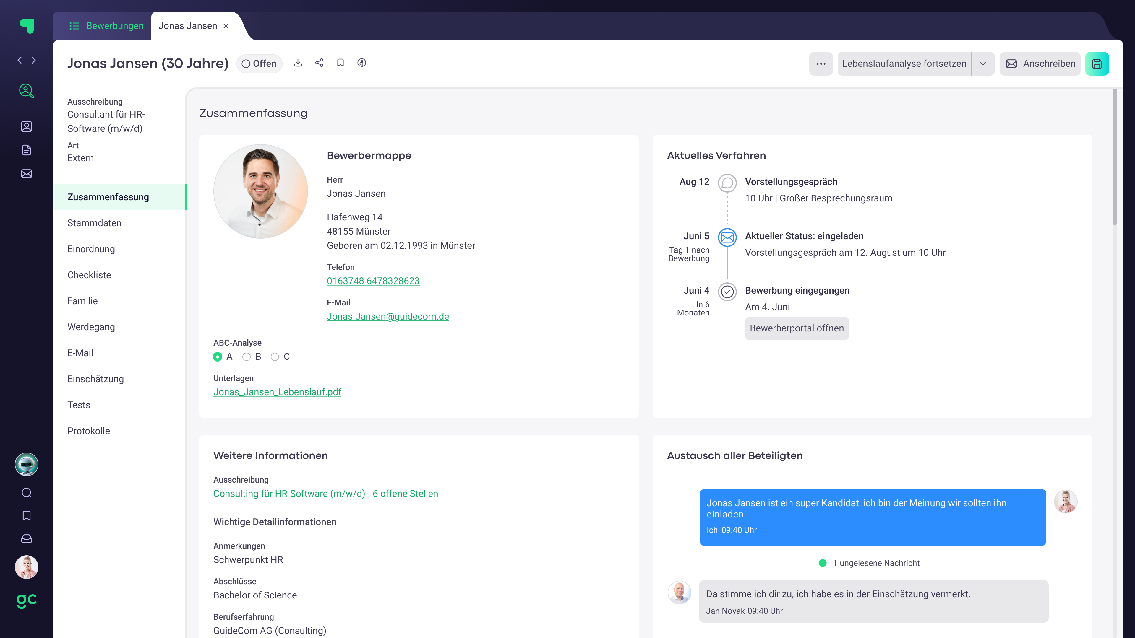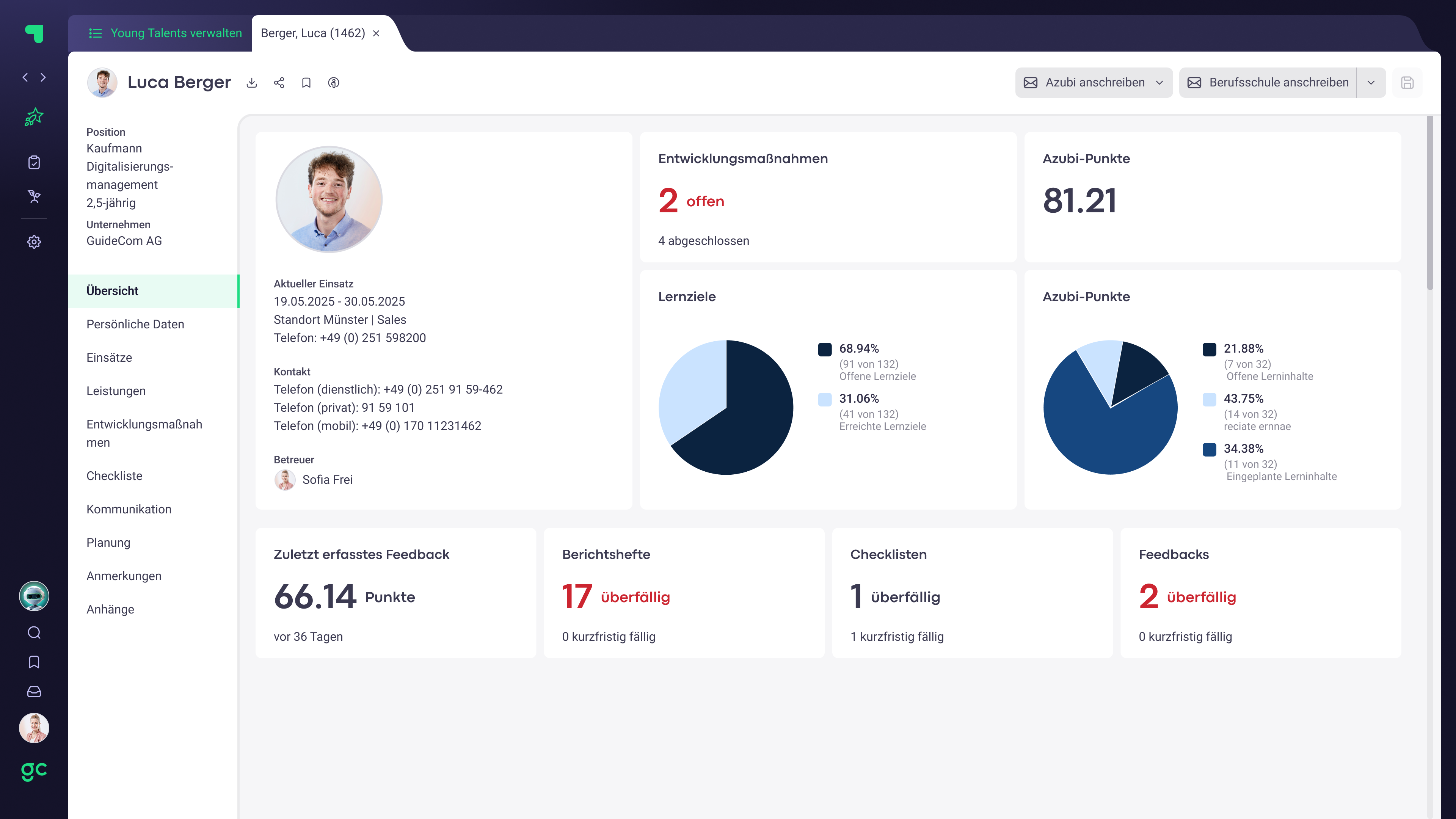 Die GuideCom HR Suite digitalisiert alle Arbeitsabläufe im Personalwesen. Vom Ausbildungsmanagement über Recruiting und Talent Management bis hin zu People Analytics. Komplexe Insellösungen gehören damit der Vergangenheit an. Vielmehr profitiert der Personalbereich von einer nahtlosen und effizienten Integration der unterschiedlichen Prozesse aus den verschiedenen Aufgabenfeldern. Unternehmen sparen durch diese Software daher nicht nur wertvolle Zeit, sondern können auch ihre Kosten deutlich senken. Die Folge: eine erhebliche, administrative Entlastung der Personalabteilung, die wieder mehr Kapazitäten für wichtige und strategische Aufgaben schafft.