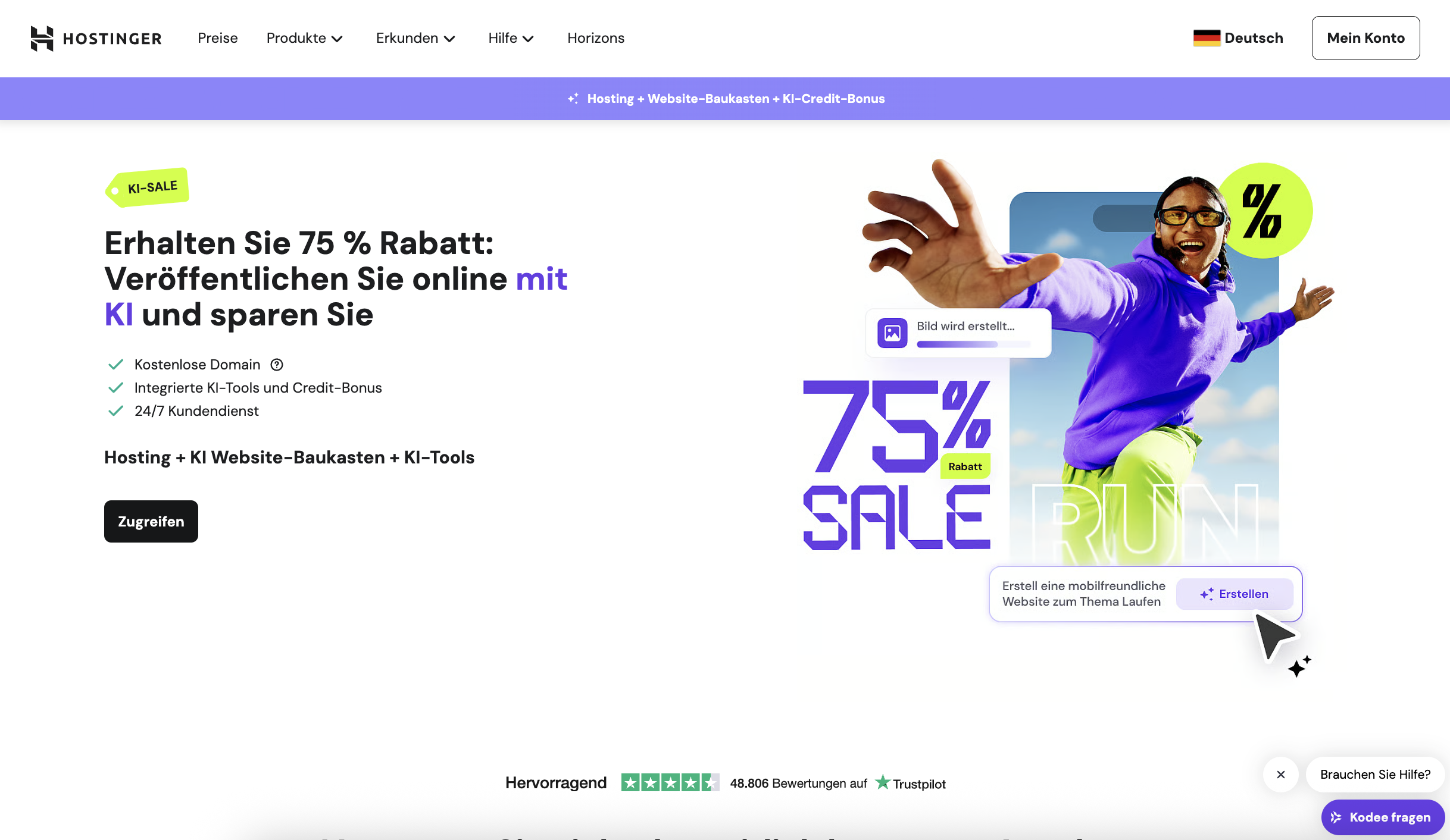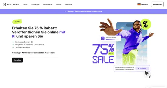 Hostinger ist ein vielseitiger Anbieter von Webhosting-Diensten und Tools zur Website-Erstellung. Das Angebot umfasst Webhosting-Lösungen wie Managed WordPress, Cloud- und Agentur-Hosting, sowie verschiedene Website-Baukästen, darunter KI-gestützte Optionen und spezielle Tools für Online-Shops. Darüber hinaus bietet Hostinger VPS-Dienste (Virtual Private Server), Domain-Registrierungen und -Umzüge sowie professionelle E-Mail-Lösungen, einschließlich E-Mail-Marketing mit KI und Google Workspace. Der Dienst zeichnet sich durch einen kostenlosen Website-Umzug, 24/7 Kundendienst und eine 30-Tage-Geld-zurück-Garantie aus.
