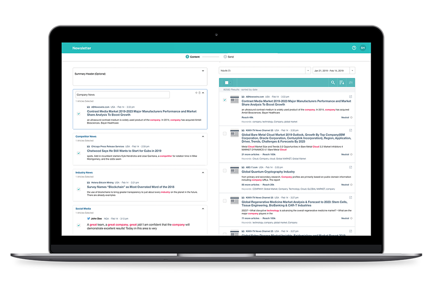 Mit einem Newsfeed werden wichtige Erwähnungen oder News direkt in die gewünschten Kommunikationskanäle – wie Slack, E-Mail oder das unternehmenseigene Intranet – integriert.