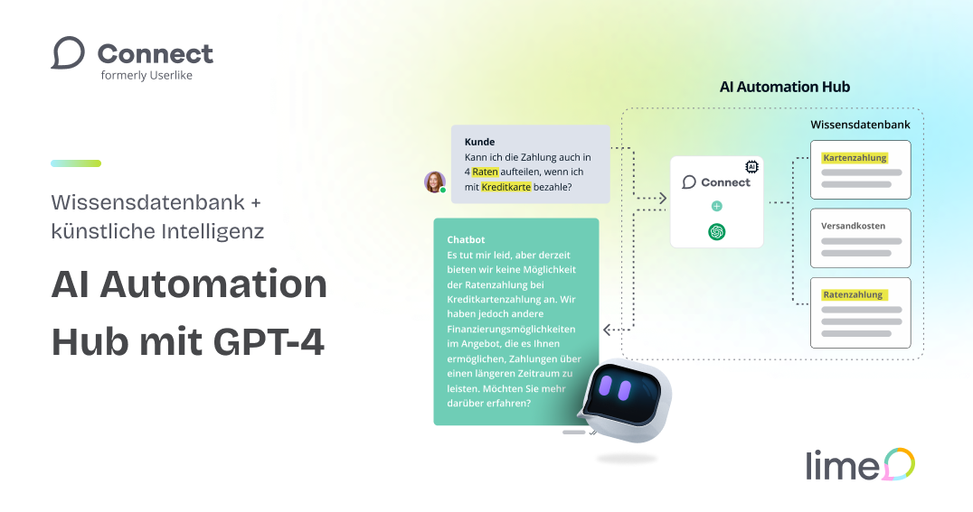 Mit dem KI-Chatbot von Lime Connect nutzen die Skills des größten Large-Language-Modells der Welt für Ihren Kunden-Support. Der Chatbot ist durch die GPT-4-Integration in der Lage, Antworten aus Ihrer Wissensdatenbank kreativ zu kombinieren und Kunden individuelle Antworten zu geben. Der KI-Support-Bot merkt sich auch den Chat-Kontext, sodass Folgefragen richtig eingeordnet werden.