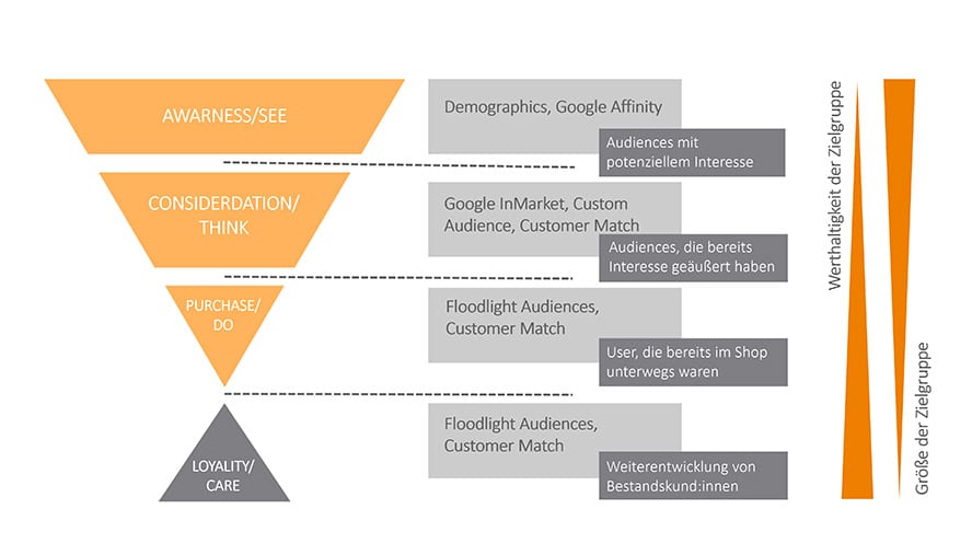 - Purchase / Do: Der bzw. die User:in war bereits im Shop und soll nun zur finalen Handlung geführt werden. Hier greifen dann vor allem die First-Party-Daten in Form von Floodlight Events (bspw. Pageview / AddToCart)