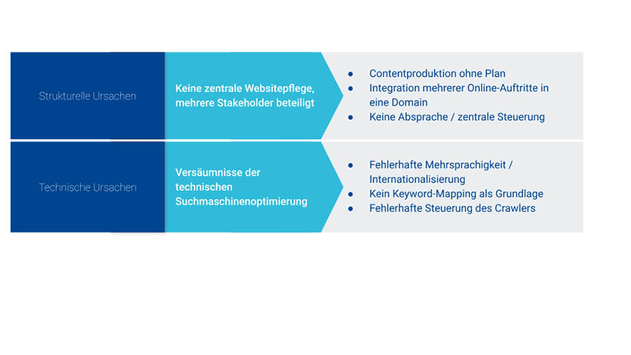 Technische Ursachen beziehen sich stärker auf Versäumnisse oder Unwissenheit im Bereich der technischen Suchmaschinenoptimierung. Sie können durchaus aber auch auf Strukturen, wenn Verantwortlichkeiten nicht klar geregelt sind, zurückzuführen sein.