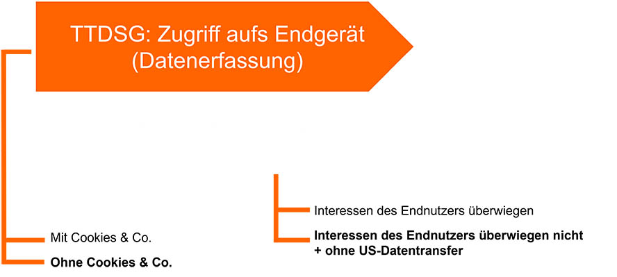 - Für die Webanalyse ist § 25 TTDSG von besonderer Bedeutung: Demgemäß sind Betreiber, wenn sie auf ihrer Website Cookies oder vergleichbare Tracking-Technologien einsetzen, verpflichtet, von jedem Besucher eine Einwilligung einzuholen. Das gilt auch für den Fall, dass technische Daten aus dem Nutzer-Endgerät ausgelesen werden, um einen Fingerprint zu bilden, über den der Nutzer wiedererkannt werden kann.